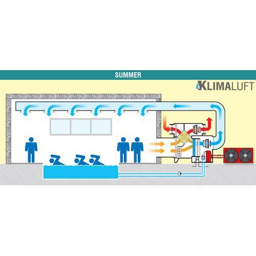 Zwembad Klimaatbeheersing en Warmteterugwinning met Klimaluft 0300 (SPR). Het eenvoudig te installeren luchtbehandelingssysteem voor zwembaden bezit een warmteterugwinunit. Klimaluft 0300 (SPR) zwembad luchtontvochtiger en ventilatiesysteem levert tot zelfs 80% warmteterugwinning dankzij de zeer efficiënte, hoog-rendement 'recovery' unit. Voor airconditioning in de zwembadruimte in de zomer is een speciale STR uitvoering leverbaar. 'Double flow ductable' zwembadontvochtiger, ontworpen voor ontvochtiging, verwarming, koeling en luchtverversing met buitenlucht in binnenzwembaden.